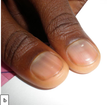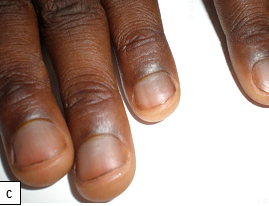 Other features that are significantly more common in HIV include transverse ridging, clubbing, splinter hemorrhages, absence of lunula, periungual erythema and proximal or total leukonychia.