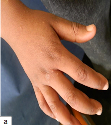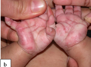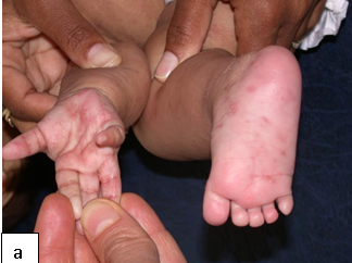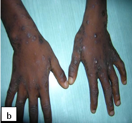 Clinical presentation: Presents with Itching (severe at nights), characteristic burrow in the interdigital web spaces, papules, blisters, nodules, and eczematous changes. The skin lesions commonly involve web spaces, flexor surface of wrists, axillae, umbilicus, waist, feet, and ankles. In HIV-infected children it can affect the face, scalp and nail folds. Crusted or Norwegian scabies is mainly seen in immunosuppressed individuals such as patients with HIV/AIDS. It is highly contagious and may be the source of epidemics.
