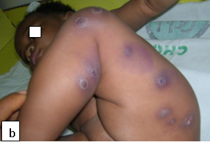 Epidemiology: The tumbu fly is prevalent in sub-Saharan Africa, thriving in the warm and humid environment. Myiasis occurs more commonly in children and during the raining season. Clinical presentation: Lesions can be painful, pruritic, and tender, and patients often have the sense of something moving under the skin. There may also be fever or swollen glands. In ophthalmomyiasis, there may be severe eye irritation, redness, foreign body sensation, pain, lacrimation, and swelling of the eyelids.