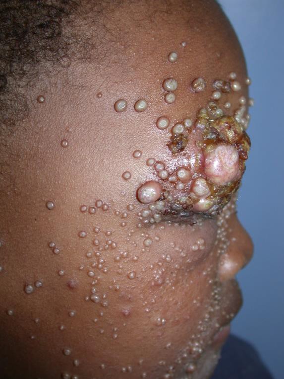 Clinical presentation: Usually present as small pearly, dome shaped, small, discrete lesions with central umbilication. In HIV-infected individuals, atypical varieties such as large or non-umbilicated lesions are found. Individual papules may coalesce to form the agminate variety. Lesions tend to be recalcitrant and resistant to treatment.