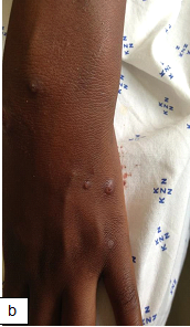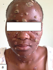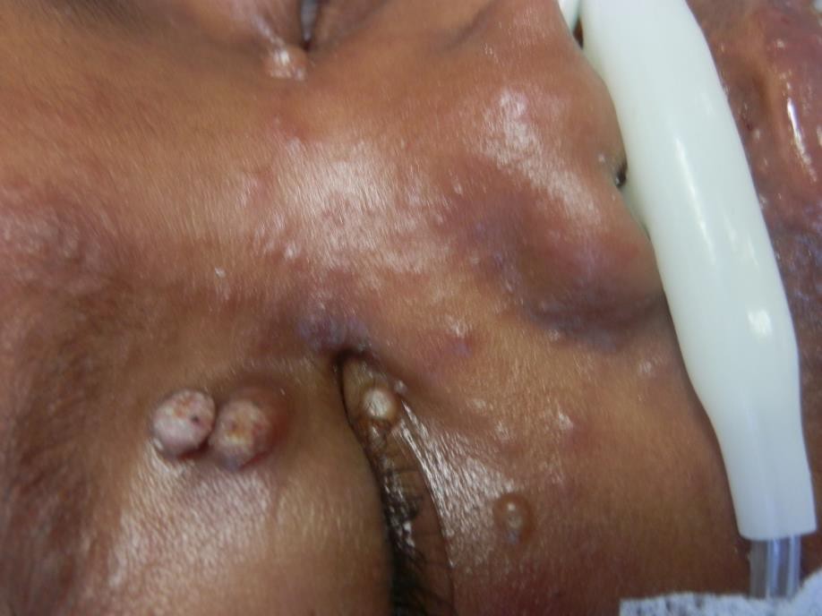 Clinical presentation: Brain, lung and skin are sites of predilection. In the skin, it presents as jelly-like necrotizing papules and nodules that resemble molluscum contagiosum. Acneiform, tumourous (warty) and papulopustular variants of the disease have been documented.