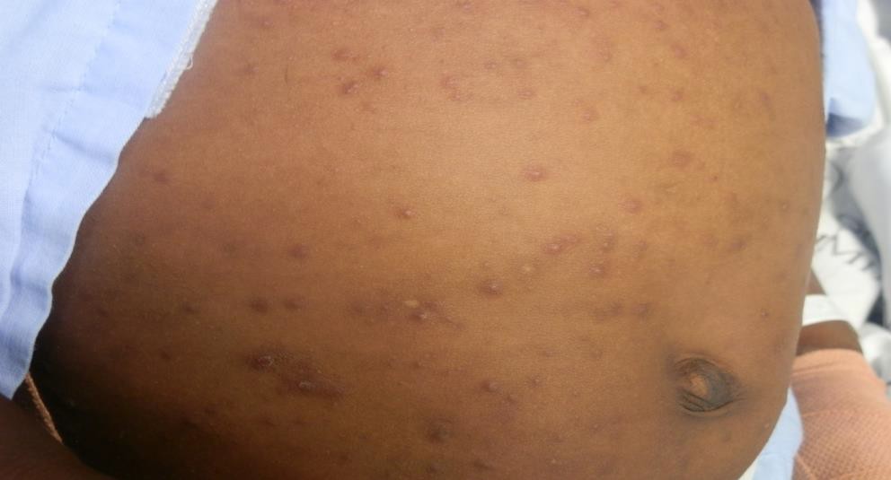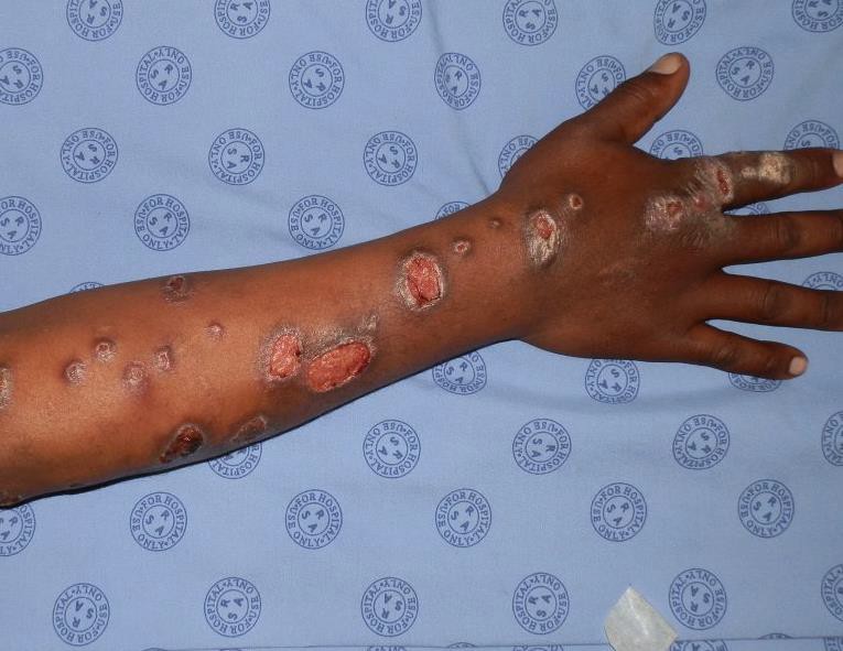 The cutaneous lesions of histoplasmosis are polymorphous and include papules, plaques, which may be crusted, erosions, ulcers, exanthems, nodules, acneiform eruptions, exanthems, molluscum-like lesions, acneiform folliculitis, psoriasiform eruptions, panniculitis, hyperkeratotic plaques, vasculitic lesions, erythema multiforme-like lesions, exfoliative dermatitis, abscesses and cellulitis. Oral ulcers and erosions are the most common manifestation of disseminated disease. There may be associated systemic symptoms including fever, lymphadenopathy, hepatosplenomegaly, lung disease and pancytopenia.