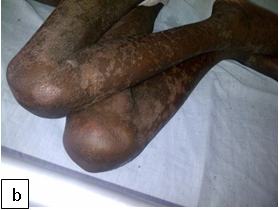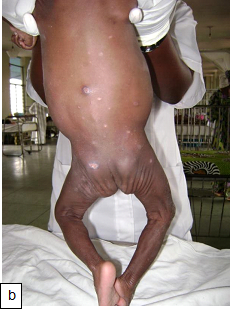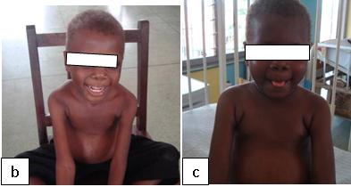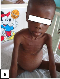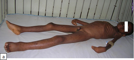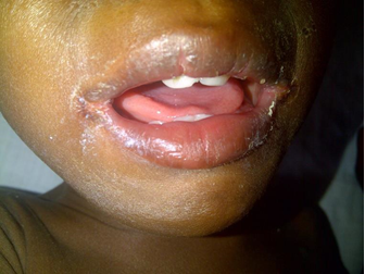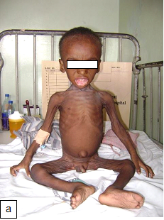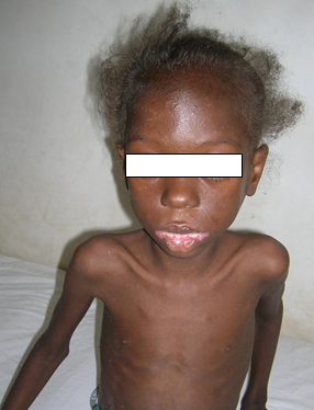 Figure 101: Plump NutsFigure 102:Severe malnutrition: MUAC 10.5 cm. Figure 103a: Severe wasting Figure 103b: Marasmus with gluteal skin folds (“baggy pants” sign).Figure 104: Severe wasting with hair changes in HIV infection.Figure 105a: At first diagnosisFigure 105b & c: (b) After 2 weeks on care (c) After 4 weeks on care.Figure 106a & b: Severe wasting and flaky paint desquamation on the lower limbs of an HIV-infected child.Figure 107a & b: 8-year-old boy with severe acute malnutrition plus oedema. He had symptomatic hypocalcaemia with carpal spasm demonstrated. The spasm resolved with intravenous calcium gluconate.Figure 108:Angular stomatitis due to riboflavin (vitamin B2) deficiency.