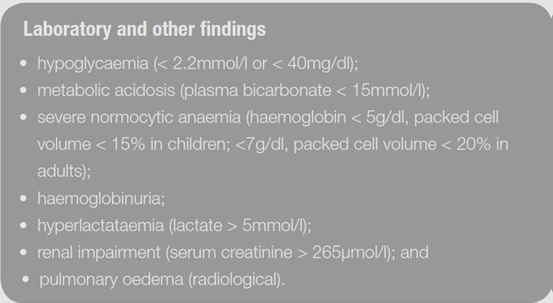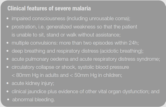 Features of severe malaria (shown in the boxes below) can occur singly or, more commonly, in combination in the same patient. High parasitaemia; parasite densities >100 000/μl (~2.5% parasitaemia) in low-transmission areas and more in endemic areas is a risk factor for death.