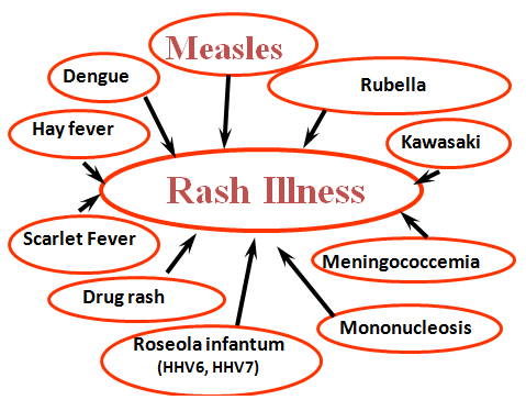 Case definition for measles: Fever with a generalized maculopapular rash and one of the following - Cough, coryza (runny nose) and conjunctivitis (red eyes). A history of contact with someone with the disease is useful.