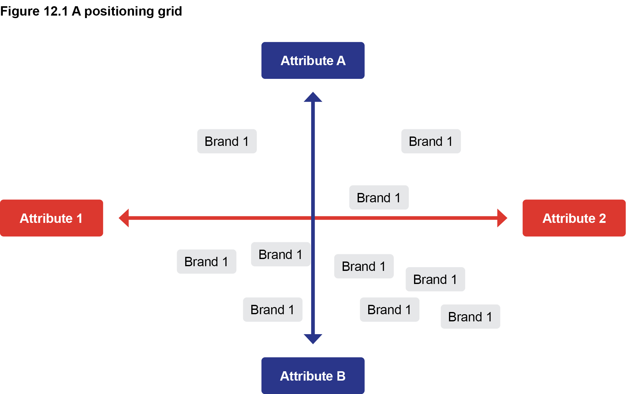 From Figure 12.1, some observations can be made about which positions are more crowded and where possible gaps exist. A challenge with perceptual maps like this is that many brand categories are complex and two-dimensional maps are not able to bring sufficient understanding to the complexity of the category. This kind of grid is just a tool to help and is not meant to be conclusive. Below are some examples of attributes that could be plotted on a grid: