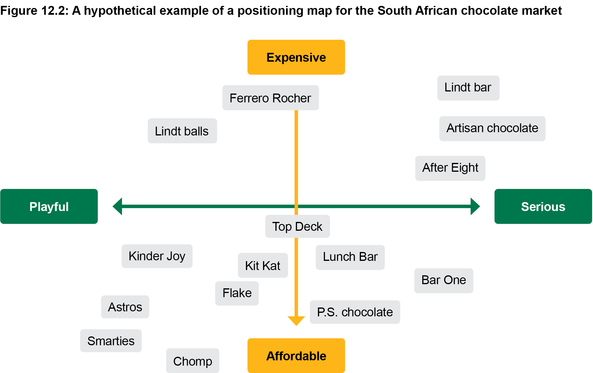Think about the example of chocolates in South Africa. The ingredients in a range of chocolate bars might be similar, but the brands work hard to position themselves in a unique position. Figure 12.2 shows an example of a hypothetical positioning grid using the South African chocolate market. In the example, one axis has a continuum from affordable to expensive. Notice that no exact prices are given as this is about perception and not necessarily fact. The other axis has a continuum from playful to serious. As mentioned, in order to create a positioning grid, all kinds of axes can be used to create a better understanding of existing perceptions and positions that occupy consumers' minds. A crucial role that these grids play is to understand where possible positioning gaps may lie.