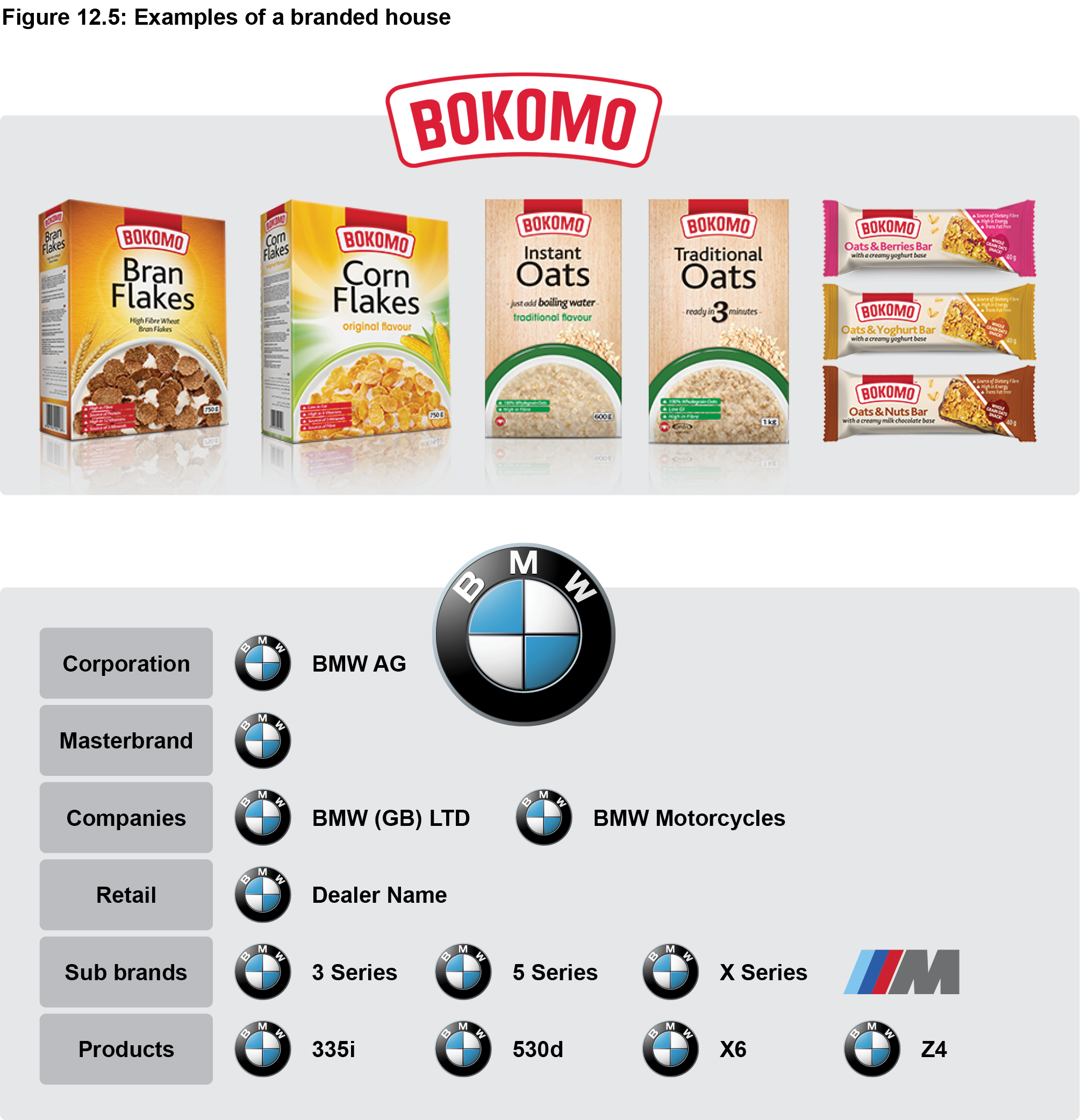 In a monolithic structure, everything is unified under a single master brand. Thus, there is one brand name and logo, one visual brand identity (colours, typeface, etc), and all variants, no matter the features or benefits, exist under the overarching brand promise. Brand extensions may be built using simple descriptors or codes. Think of Bokomo Corn Flakes, Oats, All Bran, and the BMW range.