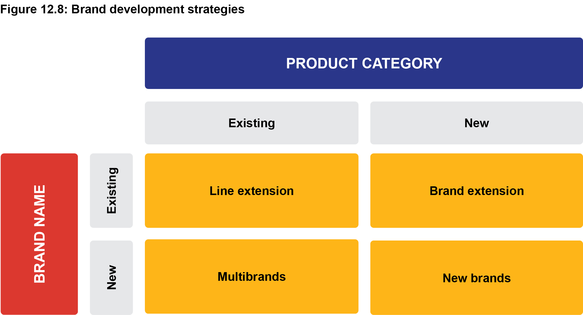 When making brand architecture decisions, a company has various options, among which are line extension, brand extension, multi-brands and new brand. These decisions are based on whether the brand name is new or existing and whether the product category is new or existing (Figure 12.4).