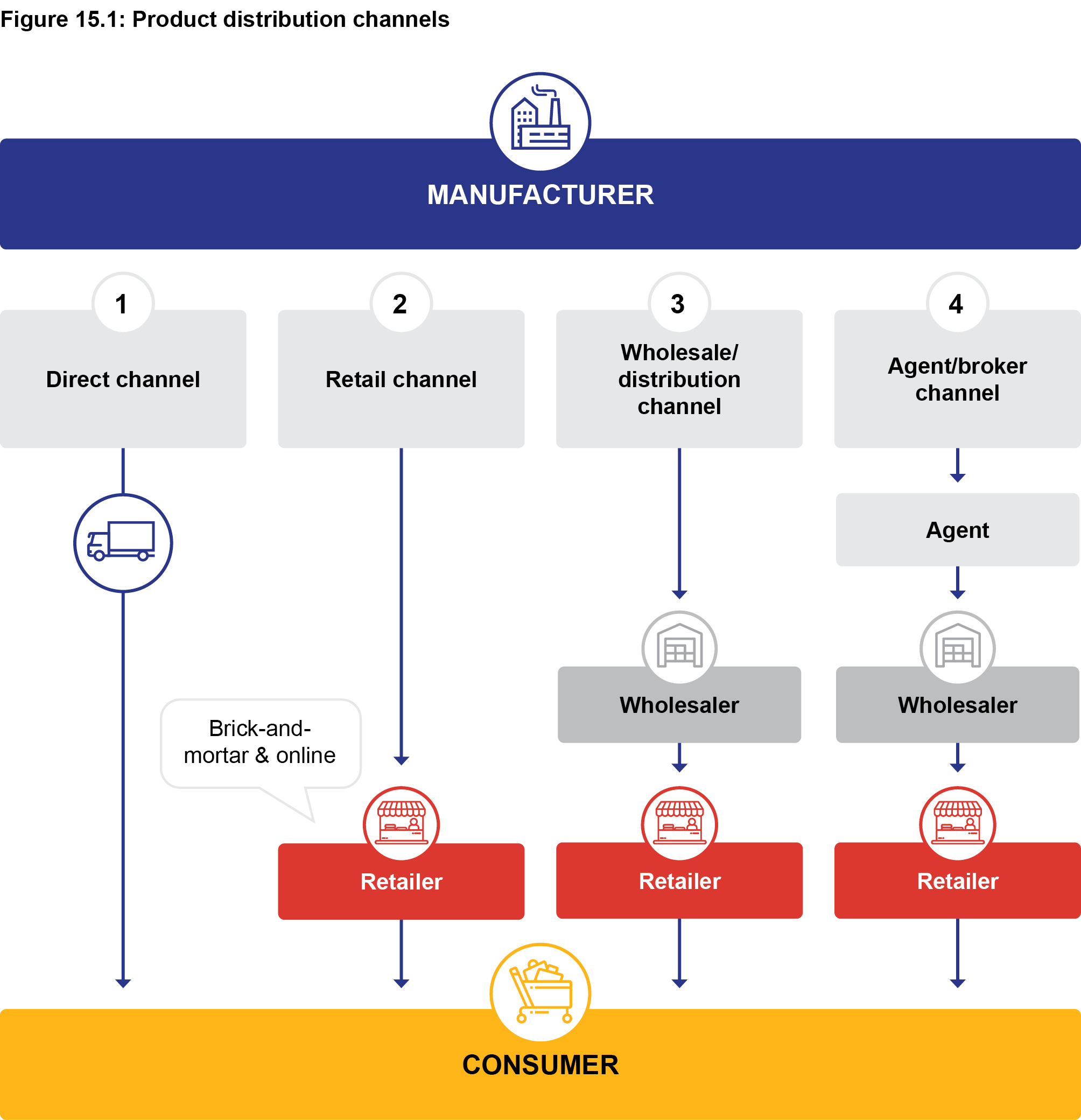 Figure 15.1 shows the four principle distribution channels available to consumer goods manufacturers. The direct channel, the retail channel, the wholesale/distributor channel and the agent/broker channel.