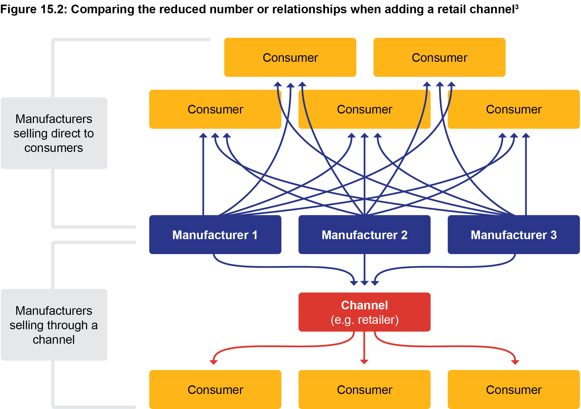 - It allows for specialisation and division of labour which in turn should allow for improved efficiencies and lower average production costs. It means manufacturers can focus on the job of manufacturing and retailers the job of retailing. This principle however is shifting with the increasing disintermediation in the market. We will look at this later in the chapter.