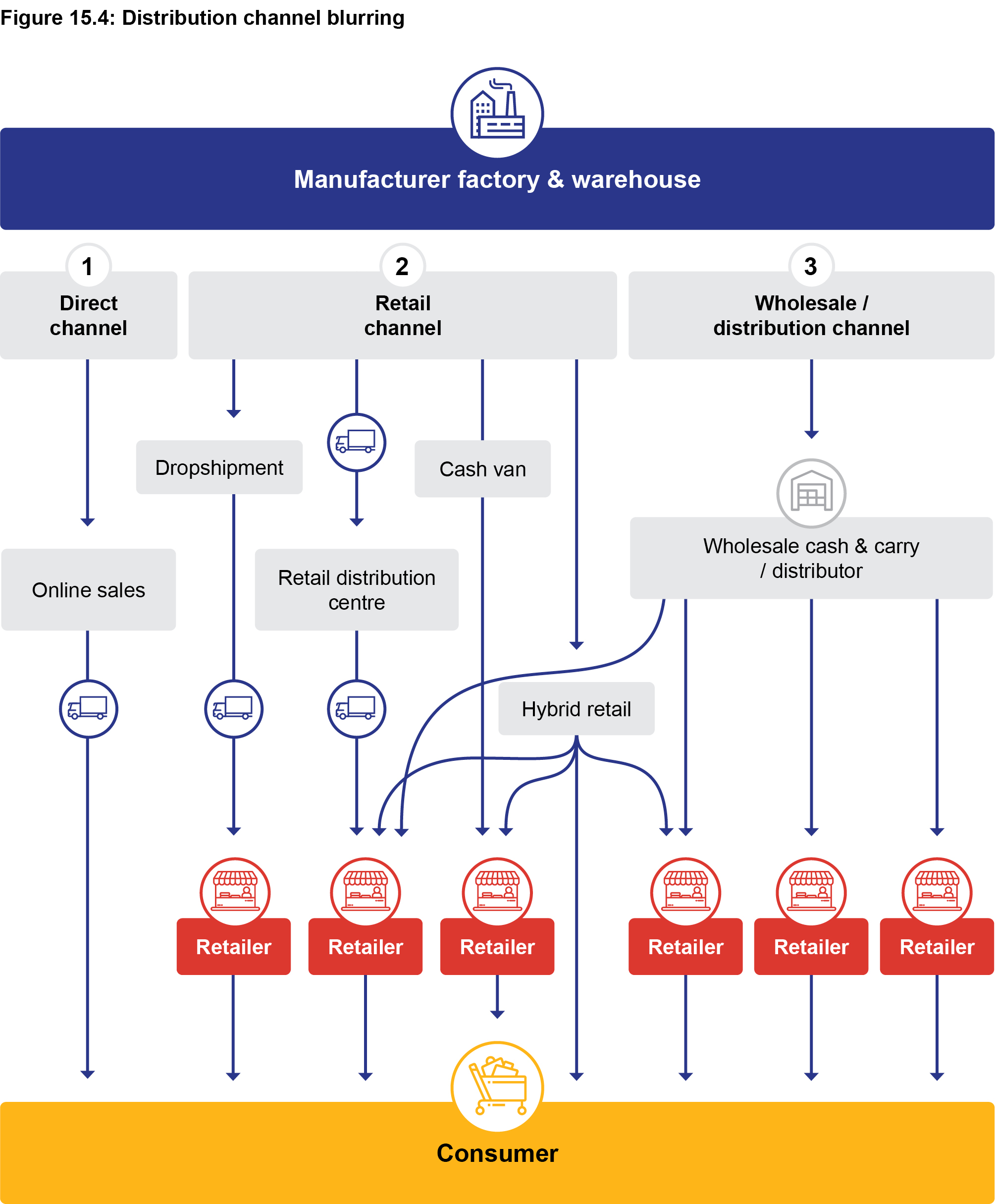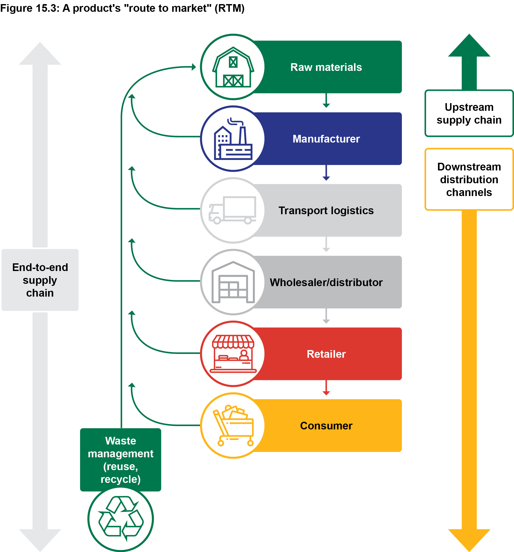 A traditional, linear view of a product's route-to-market from the product source to the consumer is shown by the blue arrows in Figure 15.3.