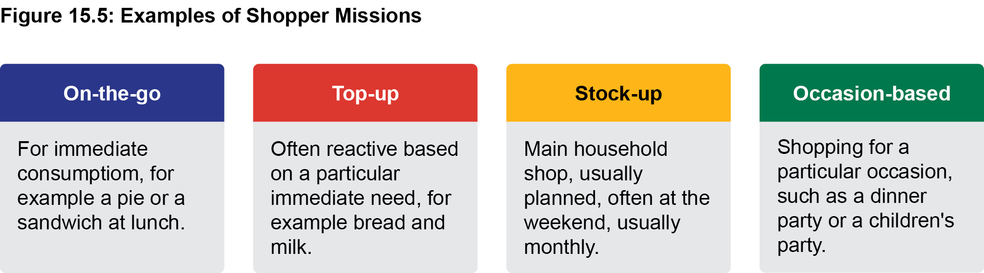 - Shopping mission. Shoppers use different stores for different reasons. The shopping mission is the primary reason or purpose of a shopping trip from the shopper's perspective. Shoppers visit different retail outlets (formats) for different reasons and marketer's need to understand the shopping mission to make sure the right product and pack size are available to satisfy the shoppers need on that shopping mission. Some examples of shopping missions are shown in Figure 15.5.