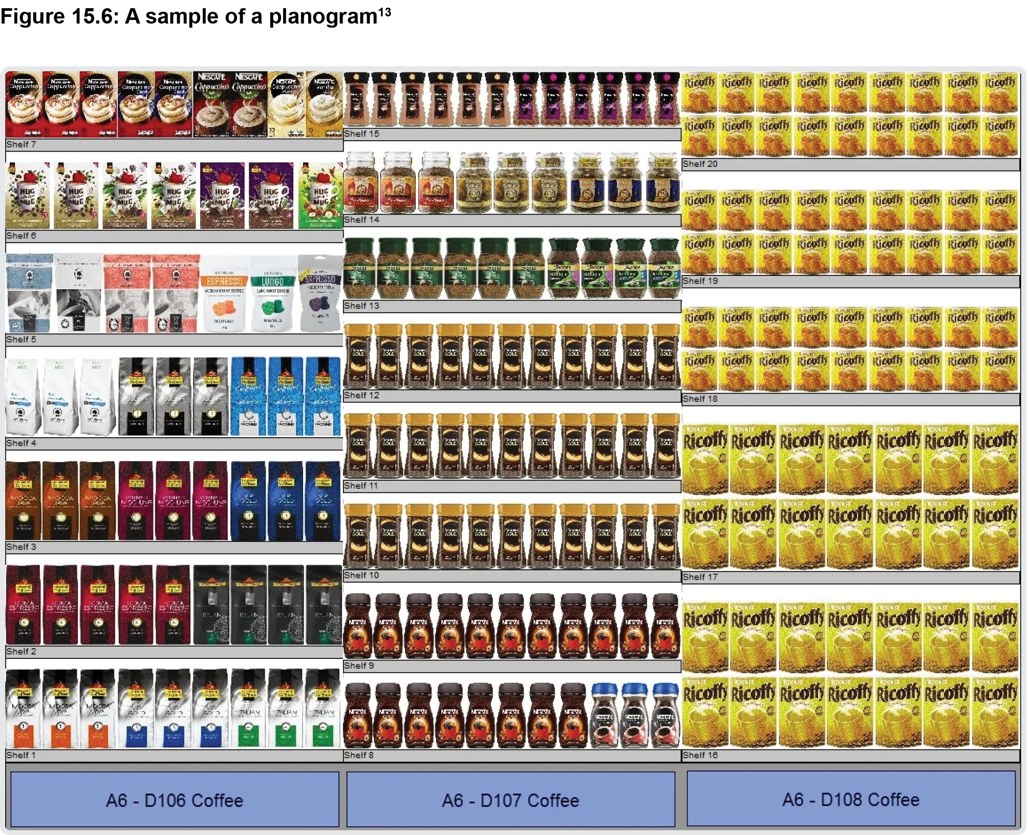 Effective merchandising can have a significant impact on the success of a product. It drives higher sales, encourages shoppers to spend more time in the store and makes the shopping decision easier. An important merchandising tool is a planogram, which is shown in Figure 15.6 and is formally defined as 'a schematic drawing or plan for displaying merchandise in a store so as to maximize sales.' [12]