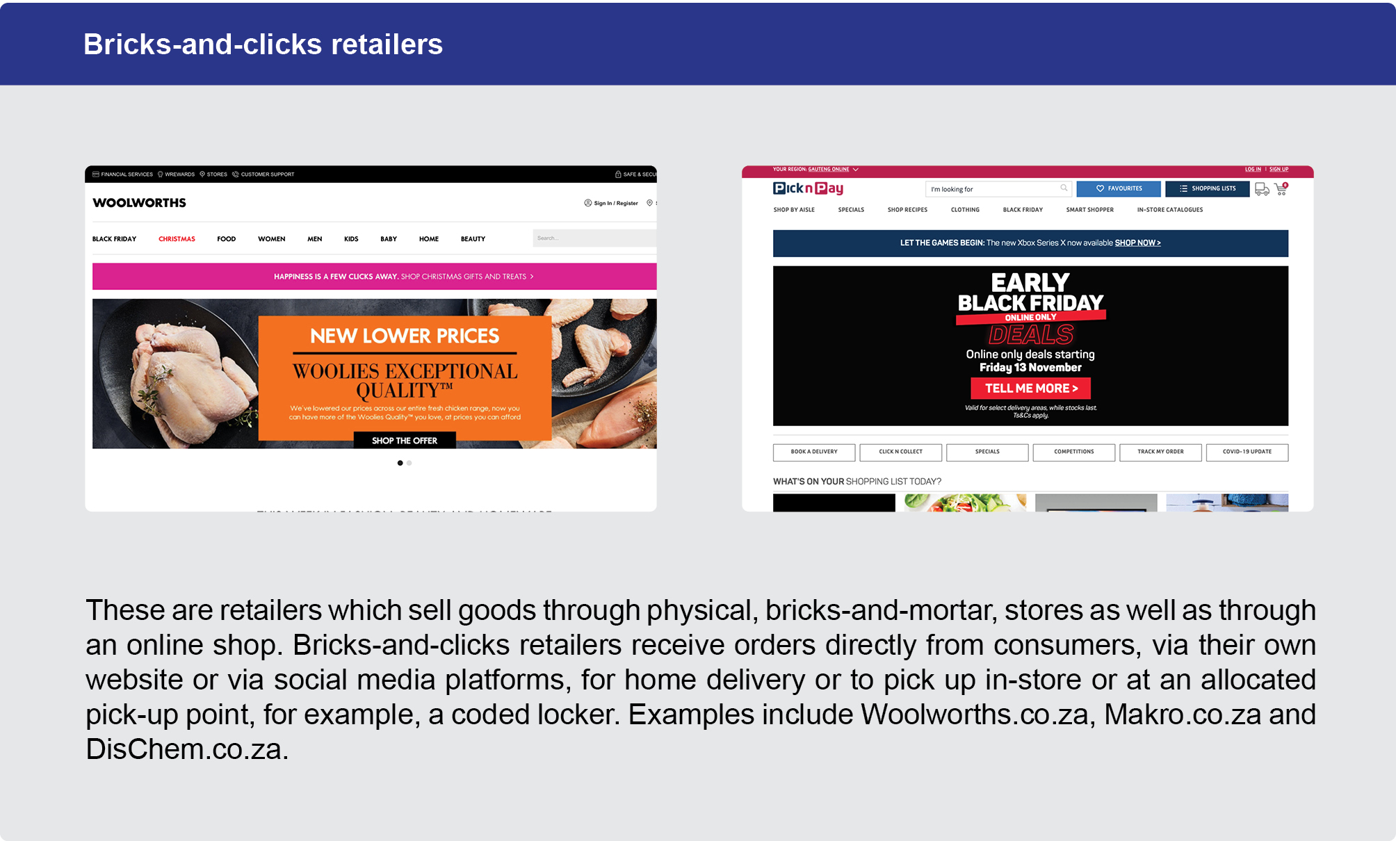 It is emerging that bricks-and-clicks retailers may be better positioned with local infrastructure and existing store networks to fulfil online sales orders in the centres in which they operate than their pureplay competitors. Retailers such as Pick n Pay and Checkers are increasingly using their physical stores as fulfilment points where online orders are picked, packed and shipped (transported) to consumers, using their own or the services of third-party logistics service providers. The use of physical stores as distribution facilities is not a new concept; it is something that has been practised by many of South Africa's strong independent wholesale cash-and-carry stores for many years.