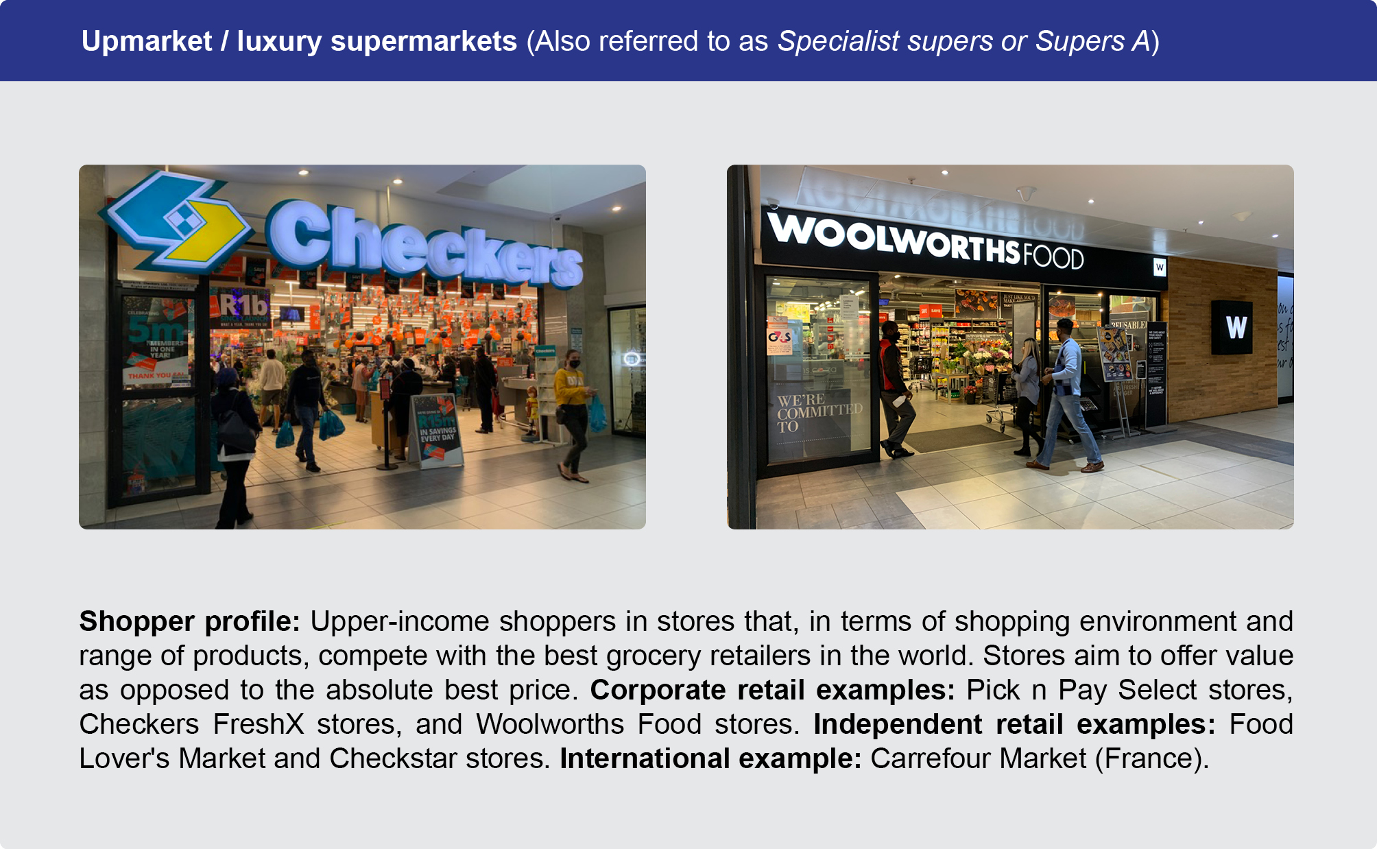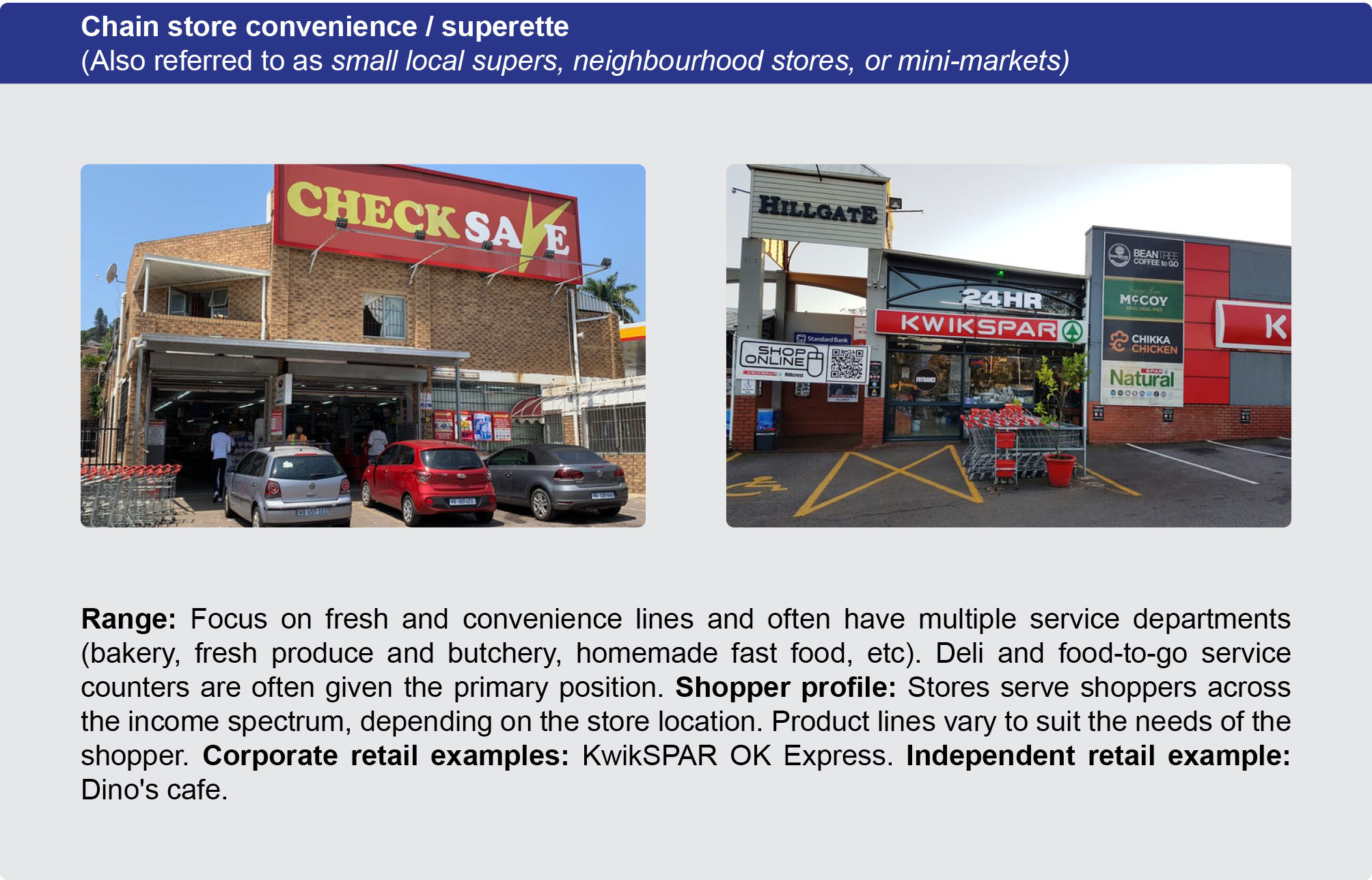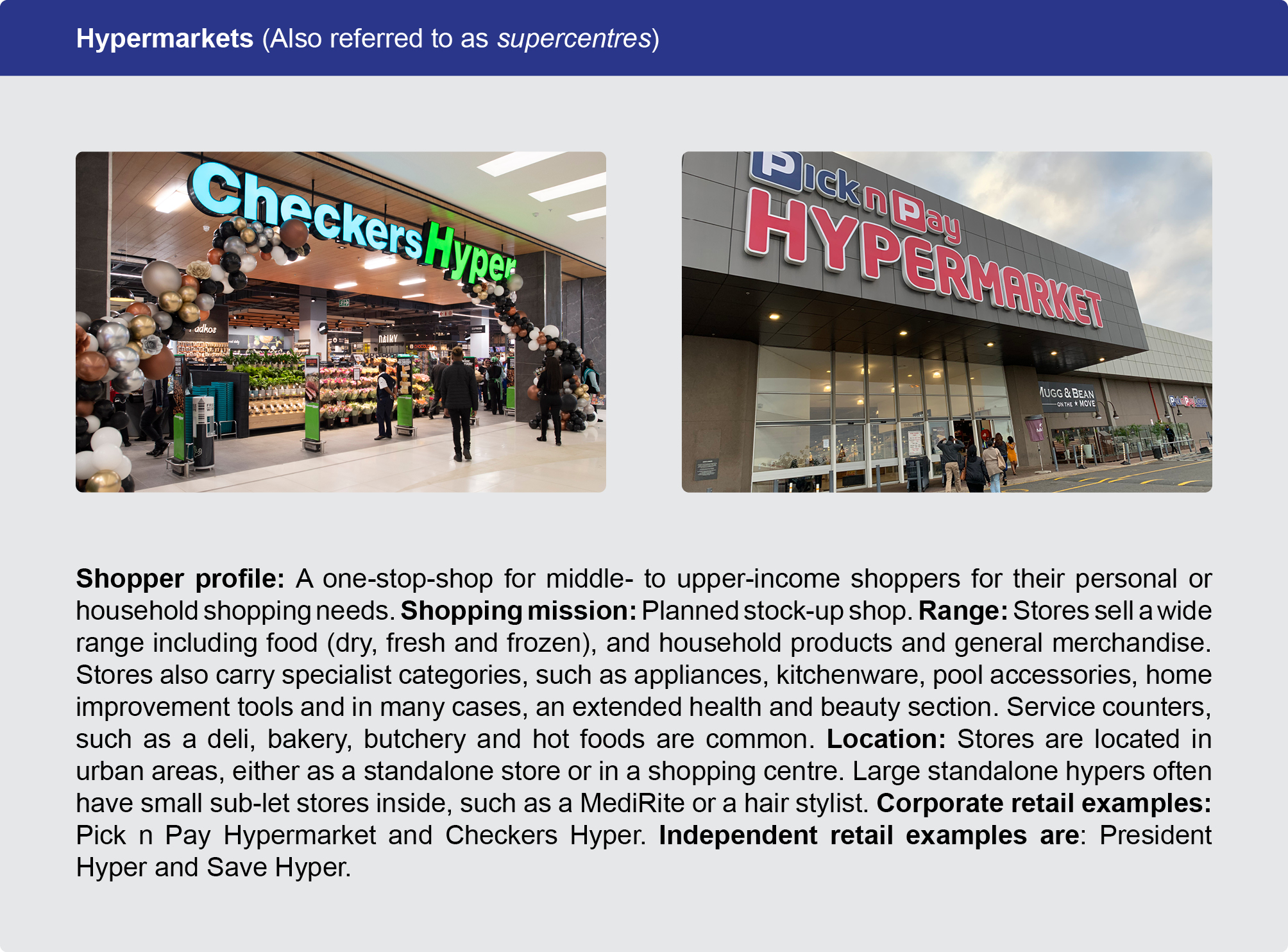 For example, Pick n Pay Express and Woolworths Foodstop are convenience format stores. They have the same attributes; a small trading area with a limited range of products catering for shoppers doing a pop-in or top-up shop. On the other hand, a Pick n Pay Hypermarket and a Checkers Hyper are large format stores with a big trading area and much wider range of products, usually catering for shoppers large monthly shopping needs.