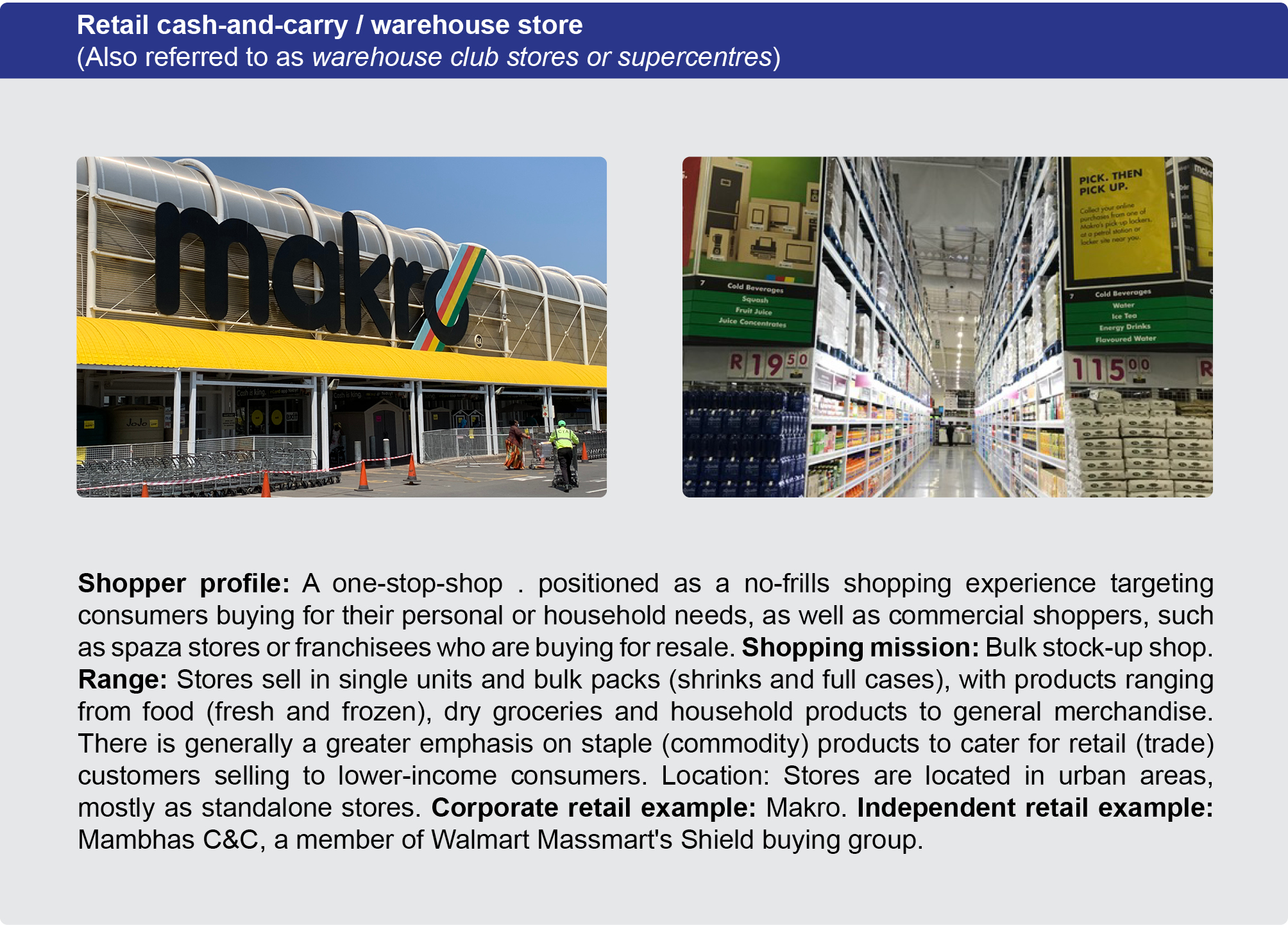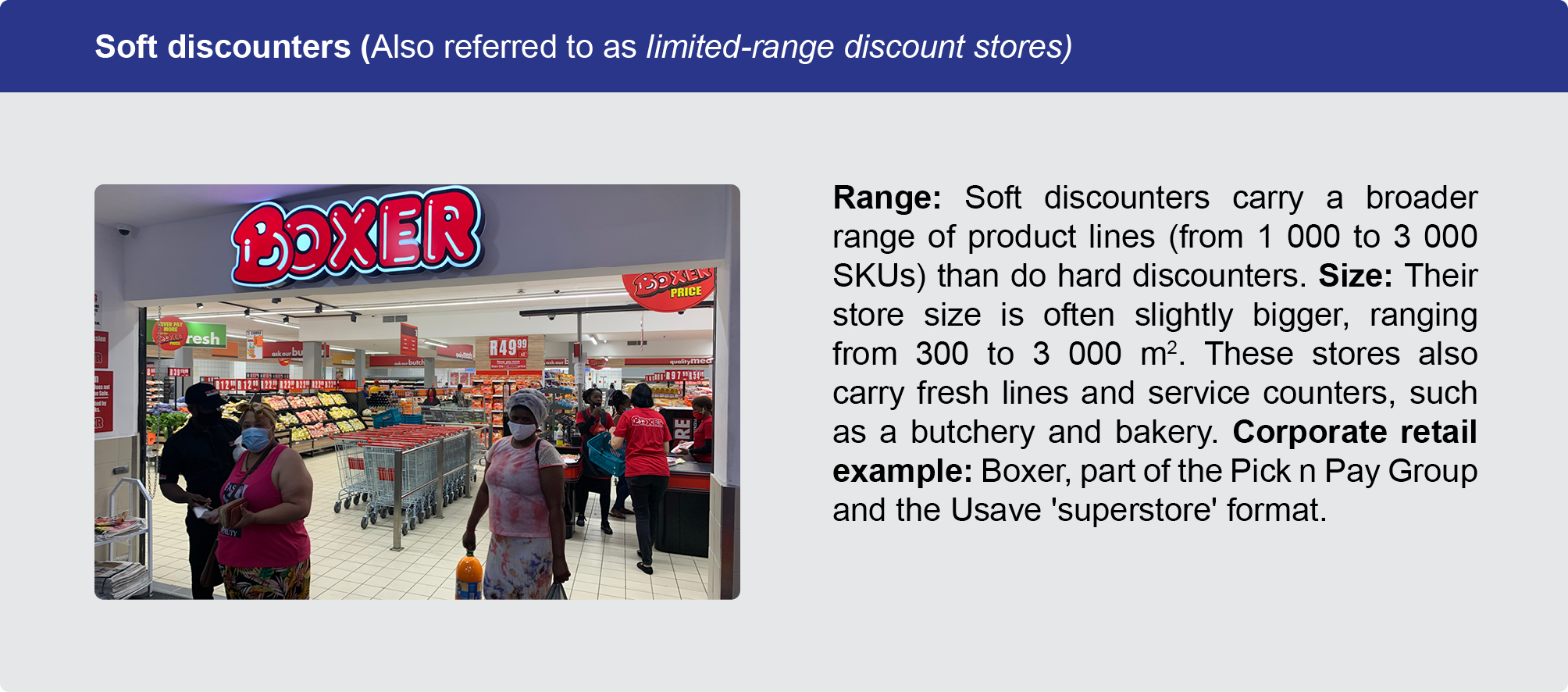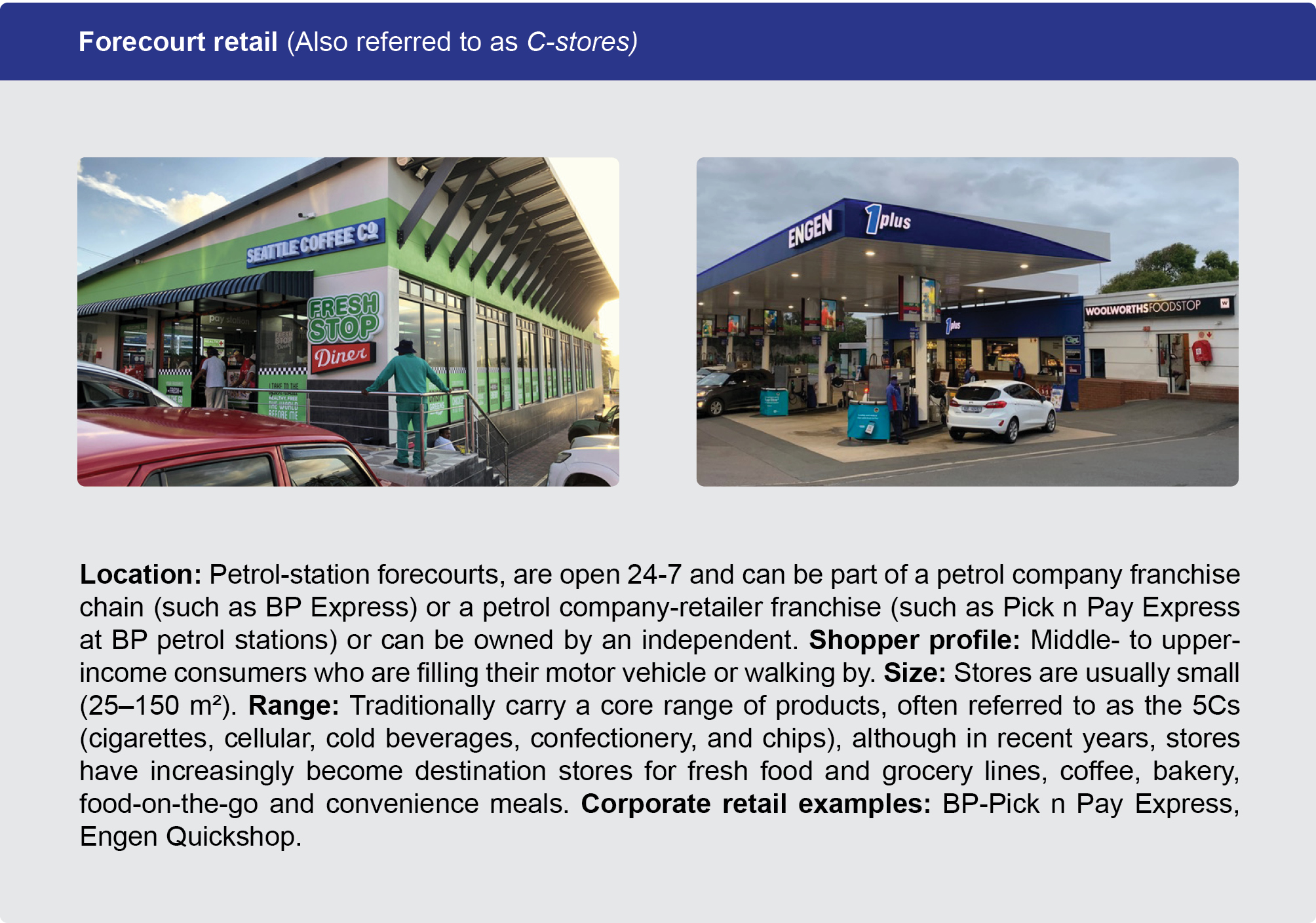 For example, Pick n Pay Express and Woolworths Foodstop are convenience format stores. They have the same attributes; a small trading area with a limited range of products catering for shoppers doing a pop-in or top-up shop. On the other hand, a Pick n Pay Hypermarket and a Checkers Hyper are large format stores with a big trading area and much wider range of products, usually catering for shoppers large monthly shopping needs.
