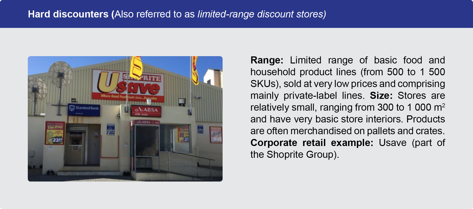 The discounter business model was developed in post-war Germany and was focused on selling a limited range of absolute necessities at very low prices in a sparse, no-frills store environment. The model is based on leveraging buying power with suppliers, selling a high proportion of private label lines and keeping logistics simpler and cheaper than a supermarket. The model has evolved over the years and in South Africa certain retailers have drawn on aspects of the model and depending on the extent of the application, they are classified as hard or soft discounters. Discounters were originally designed to cater for lower-income consumers but have increasingly captured middle-income consumers looking for a good deal.