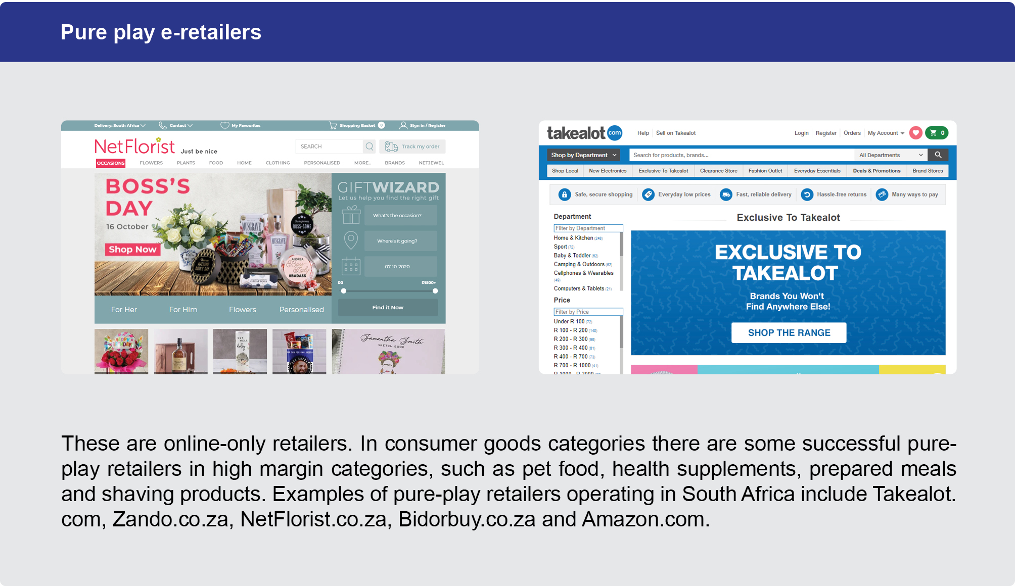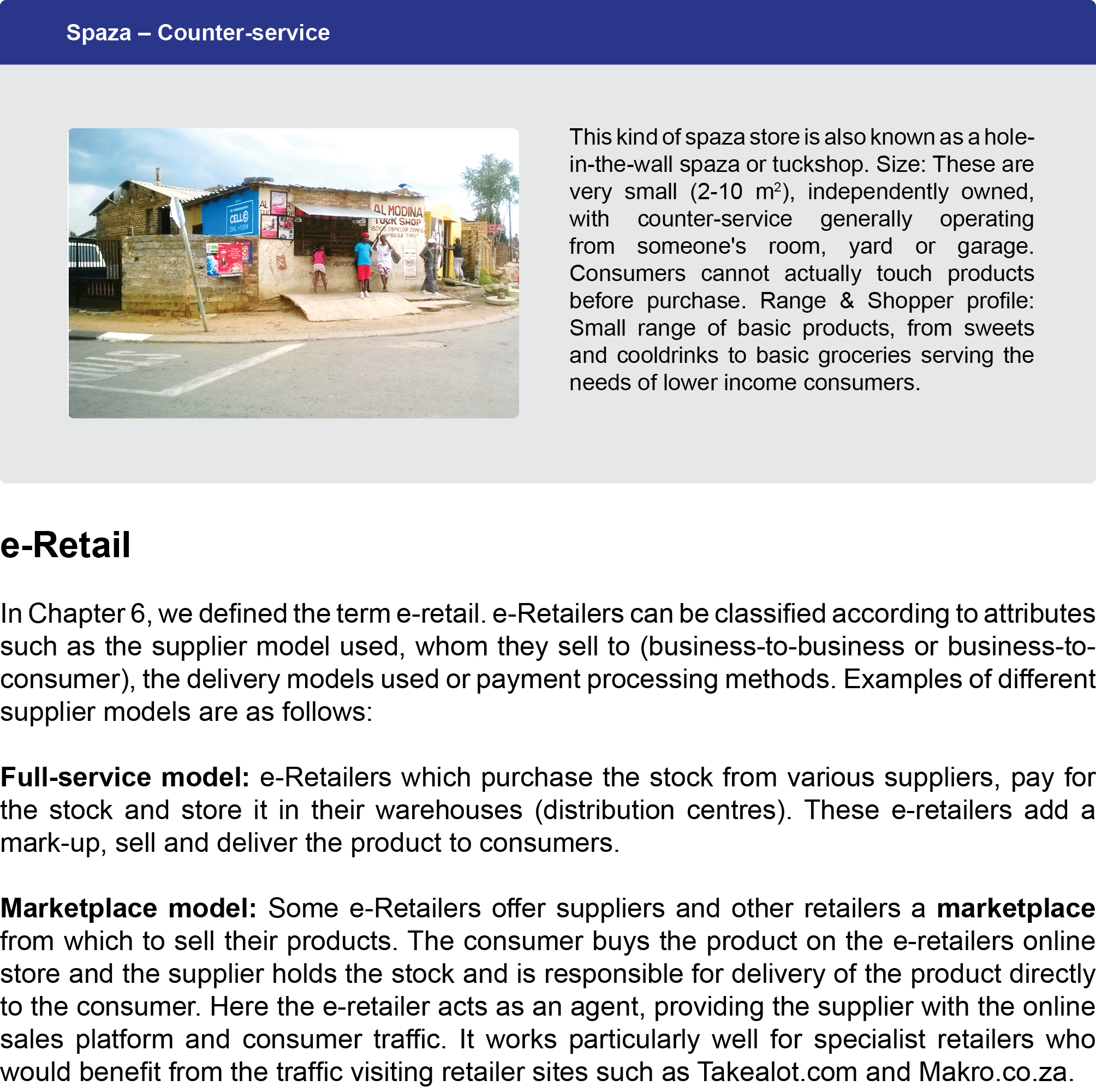 - Marketplace model: Some e-Retailers offer suppliers and other retailers a marketplace from which to sell their products. The consumer buys the product on the e-retailers online store and the supplier holds the stock and is responsible for delivery of the product directly to the consumer. Here the e-retailer acts as an agent, providing the supplier with the online sales platform and consumer traffic. It works particularly well for specialist retailers who would benefit from the traffic visiting retailer sites such as Takealot.com and Makro.co.za.