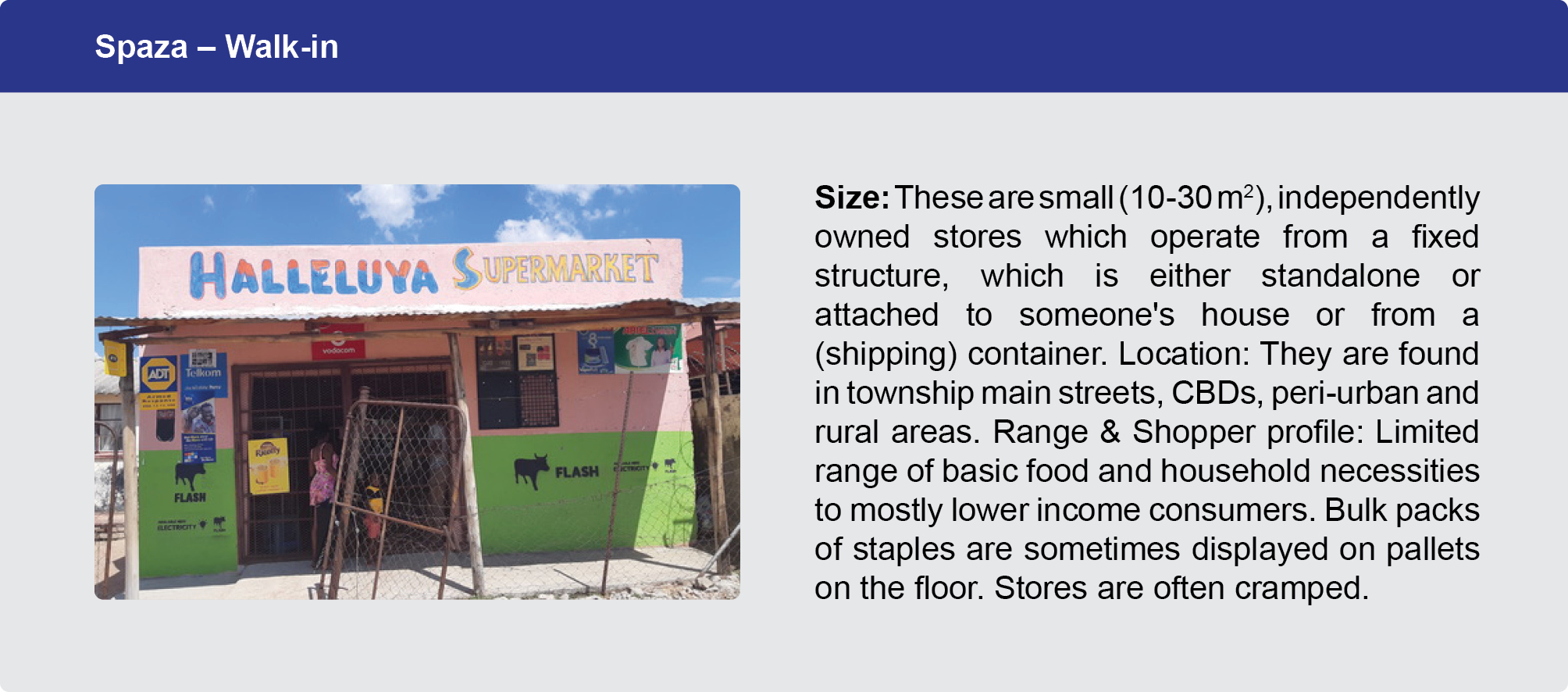 Location: By their nature, a convenience store must be conveniently located for the consumer (or must have the ability to deliver the product to the consumer as conveniently as their visiting the local store). Shopper mission: Stores serve shoppers pop-in, daily top-up or emergency shopping needs. Size: Convenience stores can be as small as an informal retail spaza store of 2 m2 to a Woolworths Food neighbourhood store of 1000 m2 and carry a much smaller range than a traditional supermarket. The shopper profile and the location of the store will impact the kinds of product lines the store will carry. For example, a Woolworths Food neighbourhood convenience store in Sandton will stock a different range of products to a peri-urban KwikSpar trading in Mthatha or a spaza in Alexandra.