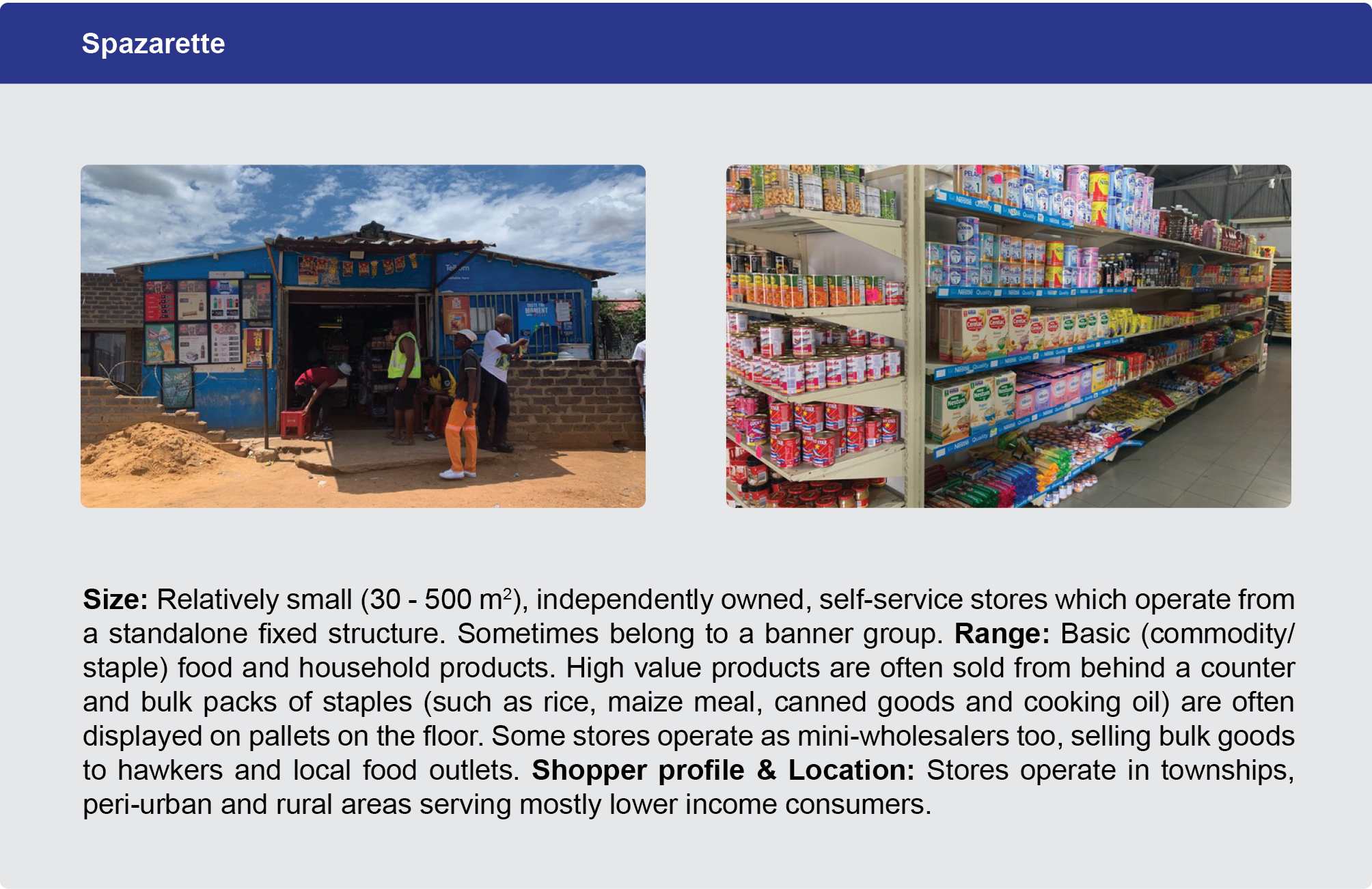 South African retail channel and format definitions were developed by Trade Intelligence (Ti) in partnership with Nestle South Africa in 2017 and validated against valuable work done by global and local consumer goods manufacturer's such as Unilever, Tiger Brands and Kellogg's on the subject.