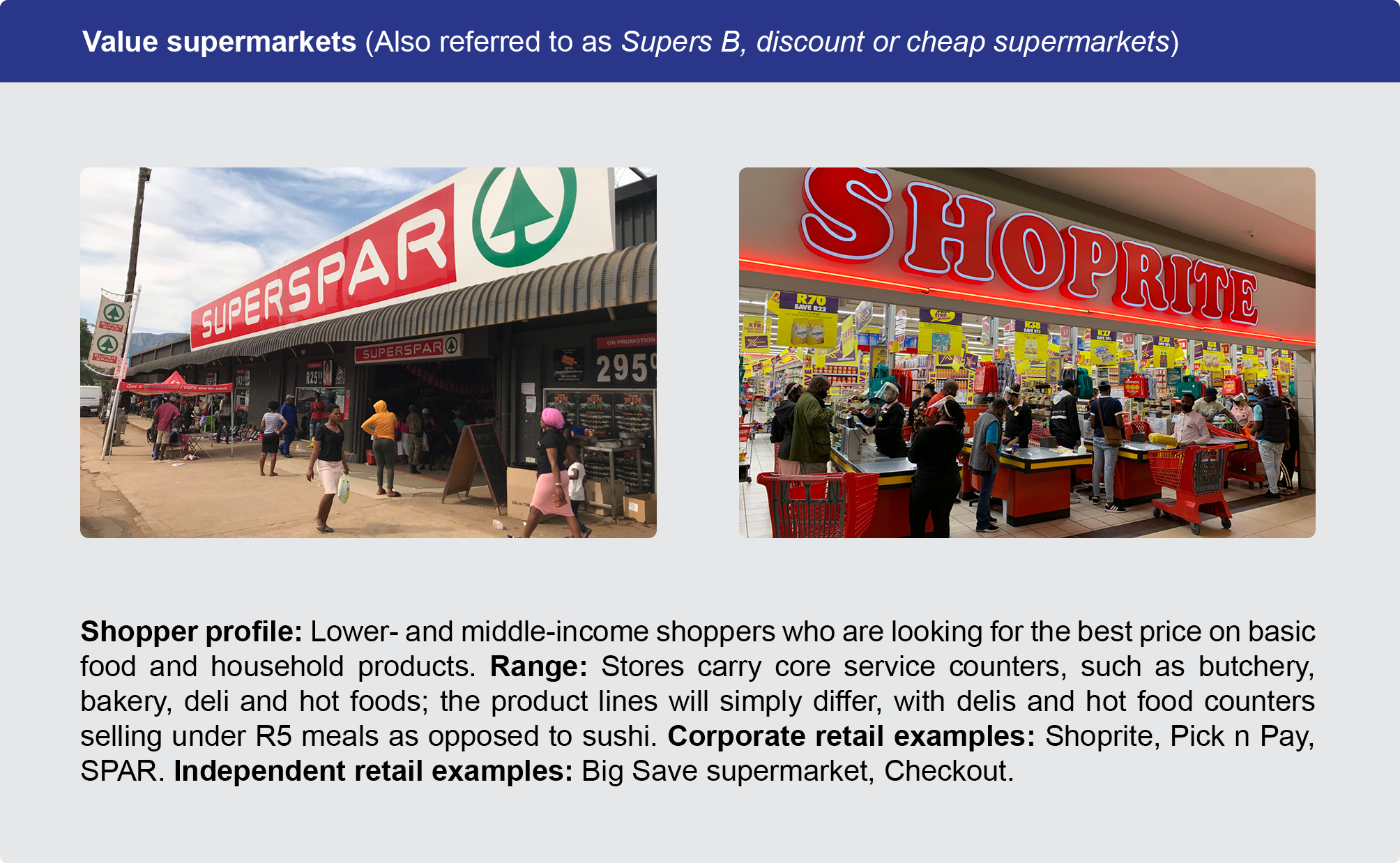In the South African context, because of the income disparity between shoppers and the impact of shopper income on the store's product range, these outlets are most often segmented according to shopper income profiles.