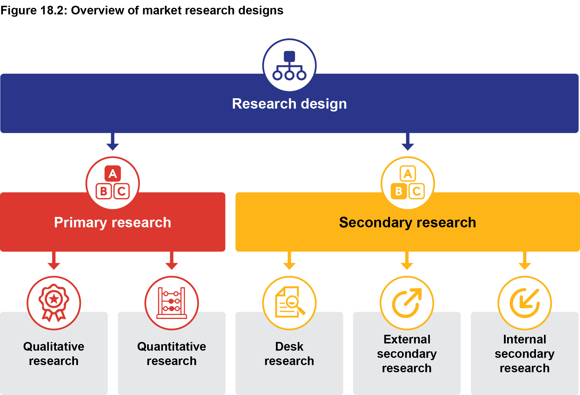 The research process explains how the researcher goes about conducting a research study. Before conducting research, the researcher should be able to identify appropriate data sources. Data is often classified according to secondary or primary data. Secondary research can comprise of desk research, internal research and external research, while primary research comprises qualitative and quantitative research, as depicted in Figure 18.2.
