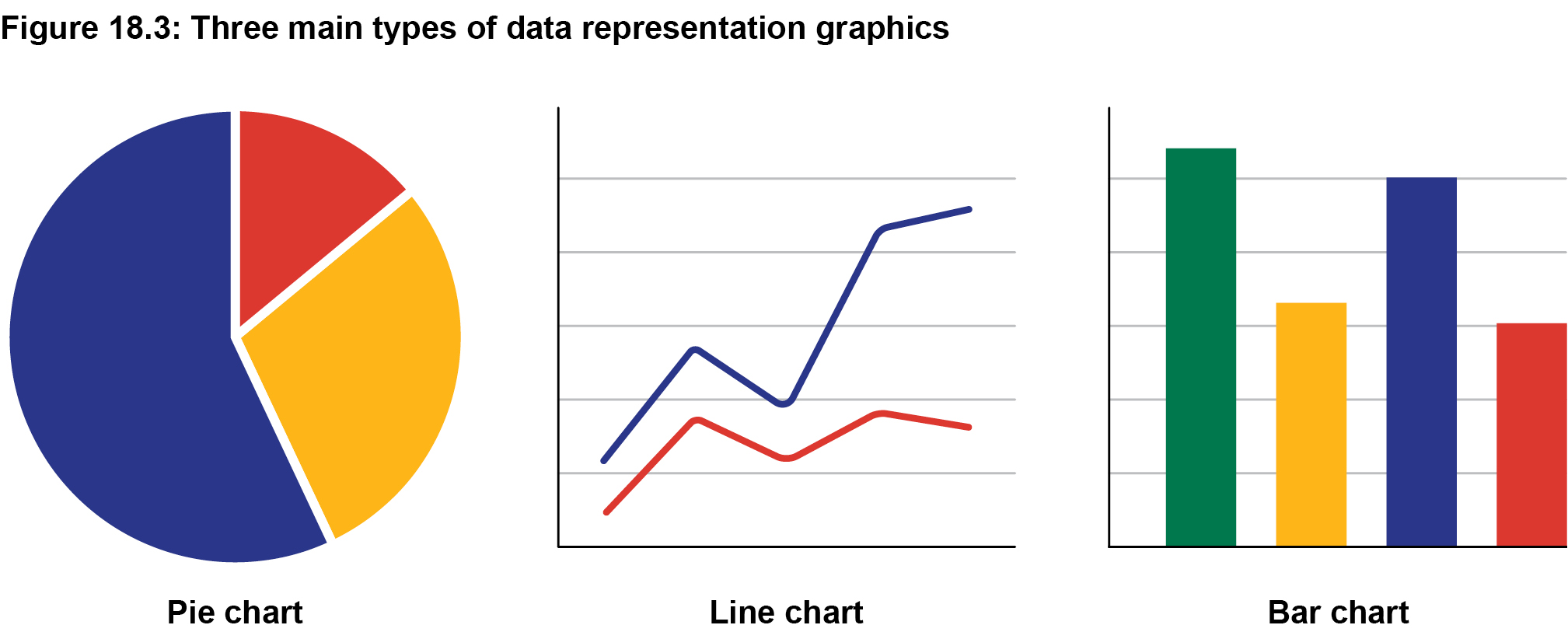 The presentation of data refers to showcasing the research results in an attractive, comprehensive and useful way so that they can be easily interpreted.[19] It is imperative that the tables and graphics in the report are easy to read, as they portray the actual results from the research. All figures and tables should also be labelled and organised logically. There are many options available for presenting data graphically, but the best option will be determined by the nature of the research problem and objectives.[20] The most common graphic representations of data are pie charts, line graphs and bar charts as illustrated in Figure 18.3.