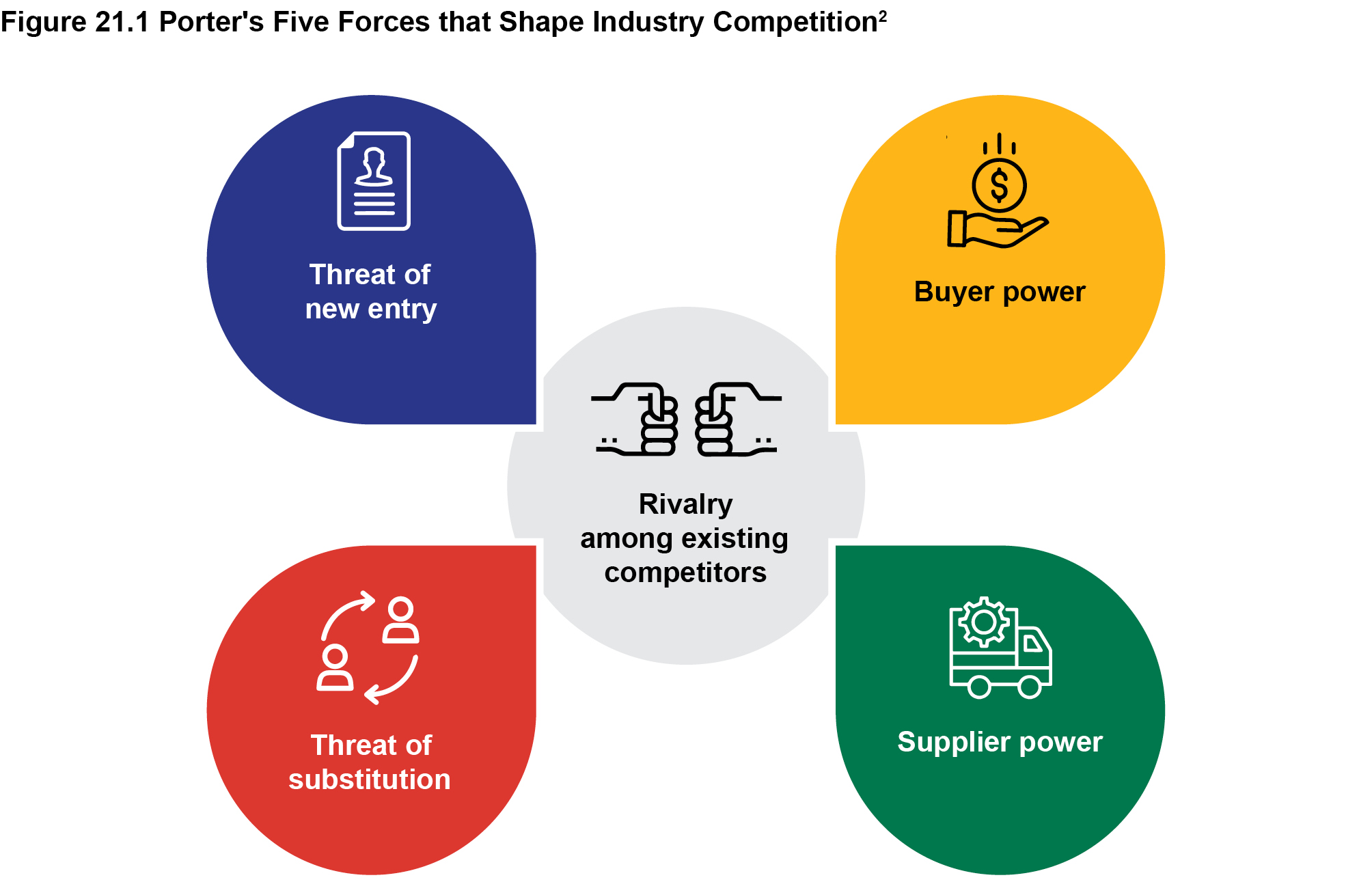 Porter's Five Forces of competitive position analysis was a tool developed in 1979 by Michael E. Porter at Harvard Business School to understand competitiveness and profitability. The Five Forces examine the potential challenges that may face the entrants, as illustrated in Figure 21.1 and expanded upon below.[1]