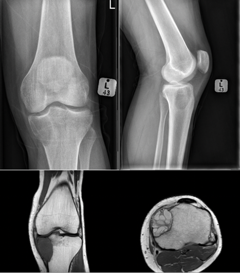 Osteochondroma.A common and benign cartilage lesion affecting young people. Often on the surface of bones or near tendons around the knee, proximal humerus or proximal femur.