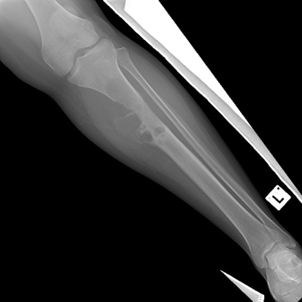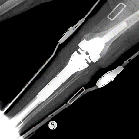 Endoprosthetic replacement. An example of a wide local resection of a patient who had an osteosarcoma of her proximal tibia. The initial X-rays show the pervasive lytic lesion of the proximal tibial diaphysis and metaphysis. The subsequent X-rays show an endoprosthetic replacement called a proximal tibial replacement. The knee has been replaced with a hinge-type knee replacement and the bone and tumour of the proximal tibia has been replaced by a modular metal prosthesis with a stem cemented into the distal femur and the proximal tibia.