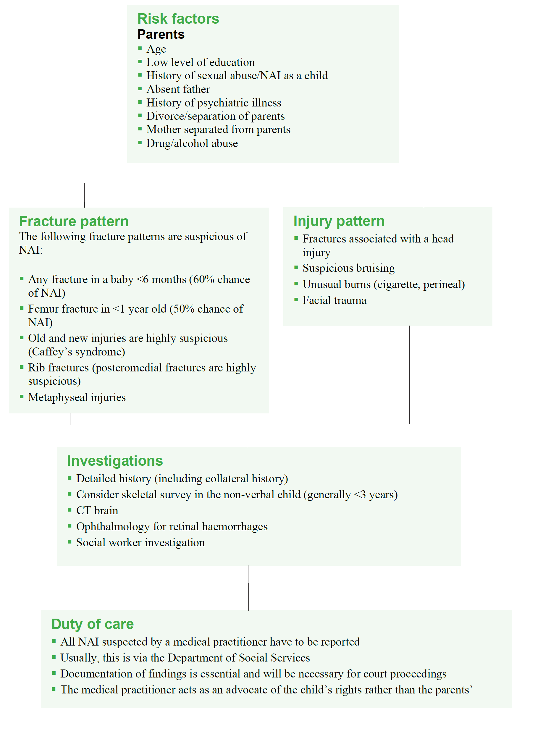 Intentional trauma to a child or neglect with subsequent trauma. Below is an approach to children with suspected non-accidental injuries.